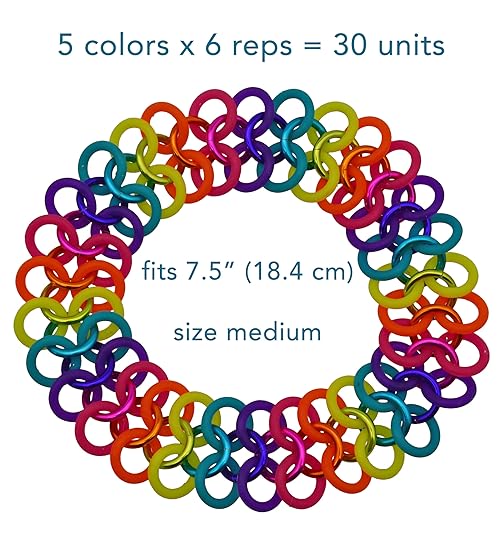 If you’re not looking to create a rainbow and instead want to cycle through a series of colors, you can still use the chart for color planning purposes. If you have 3 colors, and would like to create a medium size bracelet, your top choices are 27 or 30 units. Let’s say you choose 30 units. Divide the total number of units by 3 in order to determine how many “reps” of each color you need. In this example: 30 ÷ 3 = 10 reps. This means you’ll need 10×1 metal rings + 10×2 rubber rings in each color. In other words, 10 metal rings and 20 rubber rings in each of 3 colors, for a grand total of 30 metal rings and 60 rubber rings.