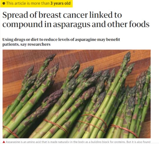 Аспарагін є не лише в спаржі — ще й в рибі чи картоплі. Зв’язок аспарагіну та розвитку й поширення пухлин не означає, що ці продукти “викликають рак”. Це не так. Втім, наразі людям, що проходять терапію раку, радять дотримуватися раціону, бідному на аспарагін і на білки в цілому. Брак аспарагіну може бути ще одним списом, кинутим в пухлину, хоч і не панацеєю. Одним словом, під час терапії раку є сенс не їсти спаржу. Мені здається, що не так вже в нас її їдять, і суттєво саме лише ця відмова терези на бік подолання раку не схилить, але ж людей цікавлять питання на кшталт “що варто їсти, що не варто?”. Ось.