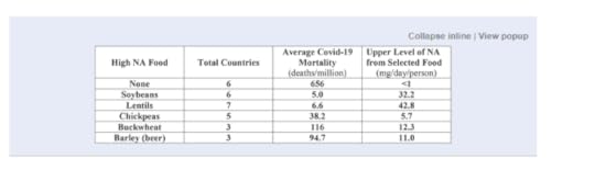 З початком же пандемії ковід-19 про це згадали і нумо досліджувати. Ось в таблиці порівняння середньої смертності від ковіду в країнах, де в раціоні багато нікотинаміну з різних джерел, та досить багато. Багато то понад 5 мг/добу. Кореляція не означає каузацію — є ще купа чинників, що впливають на смертність від ковіду (поширеність неінфекційних захворювань та генотипові особливості людей в популяції), але бачимо, що таки кореляція є. Ні, гречка зі спаржею та стаутом не лікують ковід і вакцини не заміняють!.. Але stay tuned, може спаржу проголосять офіційним наїдком сучасної чуми.