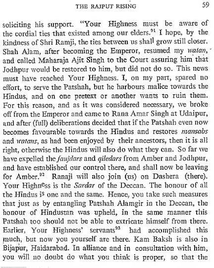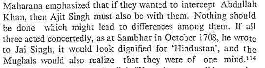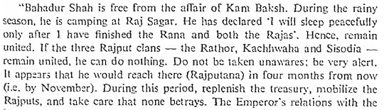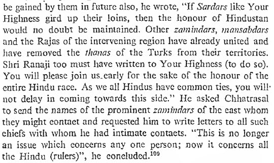 Apart from the content and sentiment. Note that when this letter was written, Jai Singh’s own Kingdom was secured from any Mughal threat, practical (Sambhar defeat) or official (Mughal offer to recognize his Kingdom). Yet he is campaigning for Hindu unity across the country.
