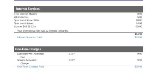 Immediately, I got my first bill over email—you can see below. It’s Spectrum, essentially a mass media and TV company, which had acquired Time Warner Cable in 2016. (Which is why it is now offering internet where I live).