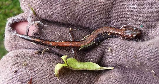 Wood that lies directly on the ground has its own fan club. Lift one up and discover it has been sheltering pink  earthworms, pale slugs and shiny brown millipedes that coil up instantly when touched.  And it’s not long before I uncover a salamander, dark, not even six inches long, with its four tiny legs and big eyes staring up at me. Sensitive to light and movement, it will skitter away as fast as its can in search of another block of wood to slide under. In the wild, dead logs provide winter shelter for such creatures, saving them underneath from deadly cold outside. This one has made an unfortunate mistake.