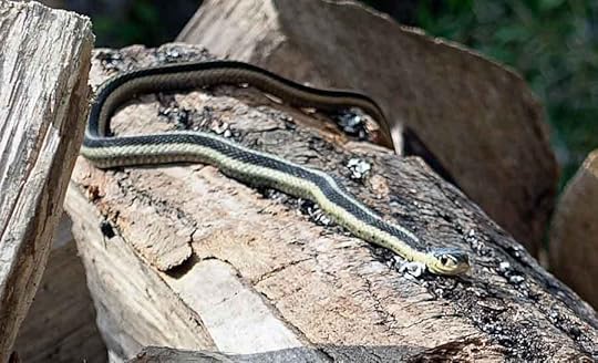 Garter snake soaking up autumn sunshine atop the pile. It needs to find a snake den soon.