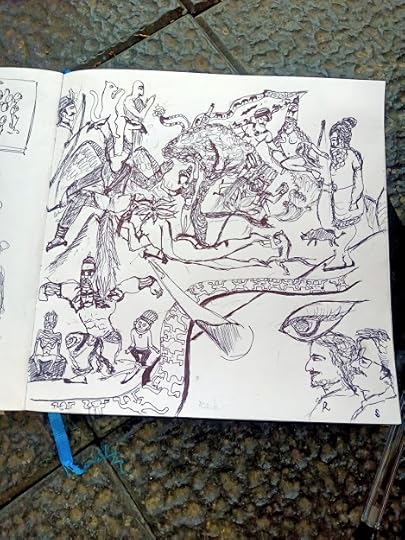 In the midst of all of this, a boar is running astray. A kirata of the forest, and bearded ascetic Arjuna have set their eyes upon it. I think of the agile Kiratarjuneeya panel of Kanchi and the fallen boar of the walls of Virabhadra Temple in Lepakshi when I sketch this episode across the page.