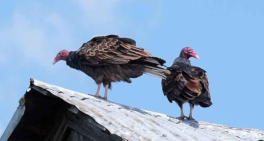 Two of the turkey vultures who like to sit in the barn roof. Sometimes there are six or seven of them. This pair checks me out for possible food value. They are almost big enough to carry me off.