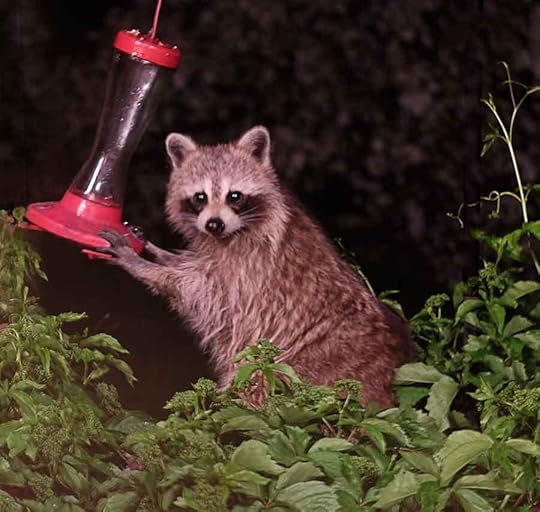Rascal caught in the act of draining the hummingbird feeder. Raccoons, squirrels and chipmunks slurp up the nectar like tipsy boozers madly hooked on the sugar high.