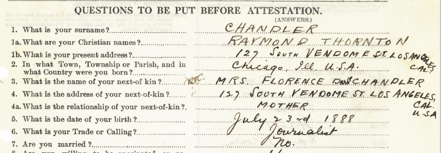 It���s startling to think of Raymond Chandler, whose brain would give us Philip Marlowe and so many deathless observations about Los Angeles, crossing the Atlantic to serve as cannon fodder in the war to end all wars. But there it is in elegant ink on Manila paper: Chandler, Raymond Thornton, Private in the 50th Regiment Reinforcements.