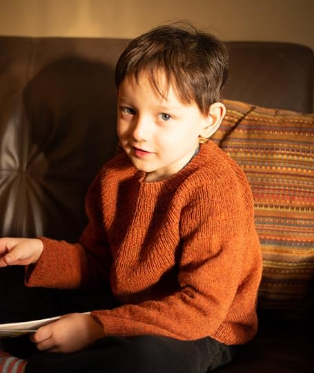 I finished Elliot’s sweater – as a matter of fact I finished it two and a half times. The first time I almost finished it I had the body done and one sleeve, and I popped it over his head for a quick check, and it was too short in the body and the arms. I took it off, pulled back the ribbing on the sleeve and the body and added another few centimeters. During this time his mother and I both measured him multiple times and were completely reassured that it would fit, which… it did not. It was still way too short in the sleeves, so I can only assume he grew faster than I could knit, which is a shocking thought. The whole thing was way too nice a sweater to be unhappy with it, so I pulled back the ribbing again and added a nice generous amount, and finally… success. It’s warm and cozy but lightweight enough for everyday, and Ellie chose the button himself. (Not shown, but it’s yellow.)