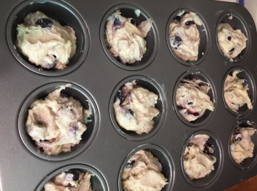 Now, using a wooden spoon, fold in the blueberries. Do not overmix. Do only what is needed.