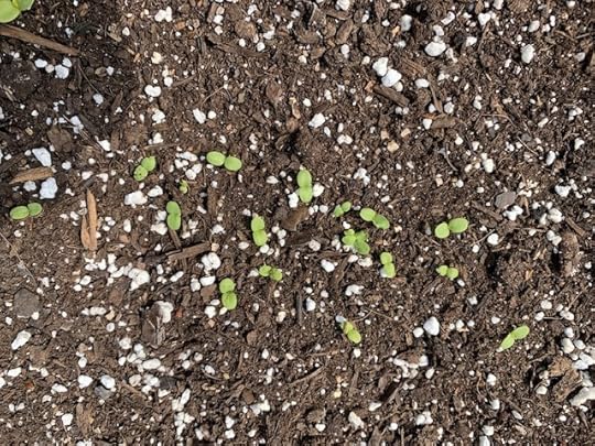 Emerging seedlings. Just tiny green dots. They could be weeds, or my imagination. But to a gardener, the first plants to show up in the spring are a gift from heaven.