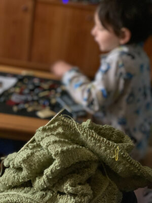 It seemed to me that I was knitting and knitting and nothing was happening. The sweater wasn’t getting any longer, none of the yarn seemed to be disappearing and it was starting to bug me. I looked within myself and wondered if (upon honest reflection) I wasn’t working on it as much as I thought? We’ve been very busy with a little project for the back garden (it’s not little, the roof of the shed caved in) and a chunk of my time goes to knitting, filming and editing for the Patreon, I’ve quietly been training for the Bike Rally (more on Team Knit later – but here’s links to our pages – me, Cam, Ken and Pato) and still haven’t made any progress on riding and knitting at the same time. (I’m starting to think it’s not going to work out) and Elliot is… well, I can’t really blame him since he’s only here a few days a week, and we’re working on his tolerance for my time spent knitting rather than playing board games or reading books. Even when I was honest about my time spent knitting, it still seemed like I should be farther along. *