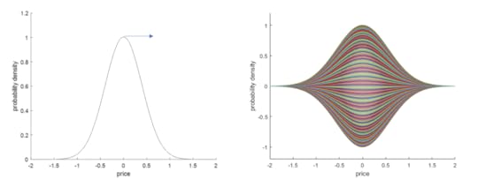 Left panel shows the probability distribution for the oscillator in the ground state. Adding an additional buyer shifts the oscillator to the right (as indicated by arrow). Right panel depicts the complex wave function rotating around the real axis.In the general case, define the imbalance to be ι = (Nb – Na )/min(Na,Nb ) where Na is the number of sellers and Nb is the number of buyers. As with the price impact result from QEF12, we then get a change in log price of x=±Yσ√|ι| where Y=√2 and the sign depends on the sign of ι. This formula is shown in the right panel of the figure below.