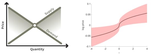 Left panel shows the neoclassical supply and demand diagram. Source: Instant Economics. Right panel shows the quantum version with the uncertainty parameter set to σ=0.02. Change in log price has a square-root dependency on the demand/supply imbalance ι. The shaded area, representing price uncertainty, shows one standard deviation.Another feature of the quantum oscillator model is that volatility is a function of the energy level, so if the energy state is En then the volatility will be σn=σ√(2n+1)=σ√(|ι|+1). It follows that observed volatility is not a constant, as usually assumed in finance, but varies depending on energy level. The uncertainty therefore increases with the degree of market imbalance, which is consistent with the large fluctuations seen during times of market stress.