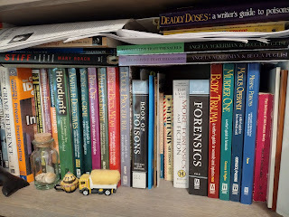 See why this worries me? Mystery writers, I’ll bet all our shelves look like this, yes?