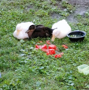 They were always hungry, but who wouldn’t be after being abandoned? After each meal, they’d drink their fill of water, then cuddle together to nap. This went on multiple times a day, the two ducks snapping flies off the injured one. After a day in the backyard, Daisy, Woodbury and Nibbles, started getting more energy and felt at ease voicing their demands. The little, brown Rouen duck’s limp eased and he and large white Pekin got comfortable enough to hop up the steps to the door to quack for more water. At least a hundred worms and a lot of duck poop later, I was able to locate Lisa and her waterfowl rescue on Facebook.