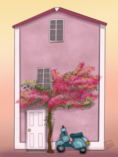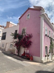 Every street in Portugal has lovely houses and building like this. Not all of them have the fabulous bougainvillea and adorable moped. I changed the colors a bit, because hey, art.