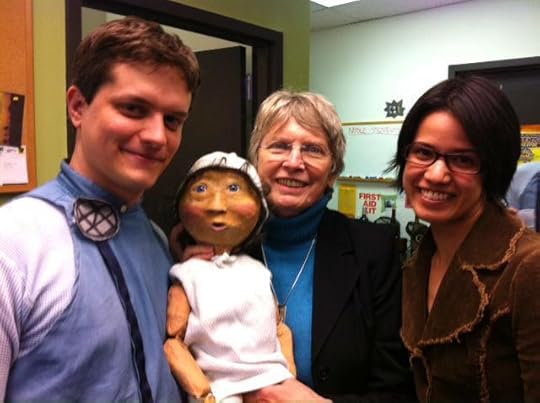 The production of THE GIVER in Chicago used a puppet as a baby; here is the puppet-baby with Jonas, played by Aaron Lawson and also the puppet-maker, Taylor Bibat. Usually the baby was wrapped in a blanket and so the audience would only see a waving hand or nodding head; and the sound...whimpers, giggles.. was provided very effectively as well.