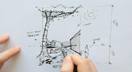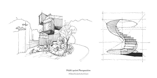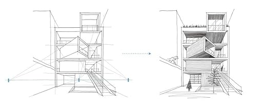 Sharifi-Ha House in Tehran, Iran - The rotated middle box doesn’t fit into a simple 1-point perspective view, and we need 2 more vanishing points to describe it. Find the full step-by-step tutorial on this alongside other 99 famous buildings in my newest book 100 Buildings & Archtiectural Forms.