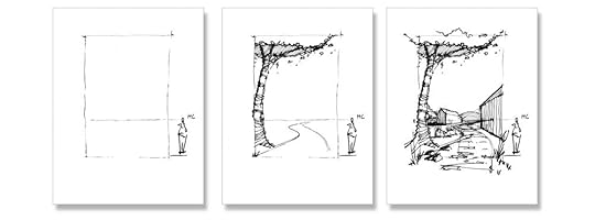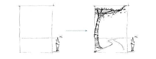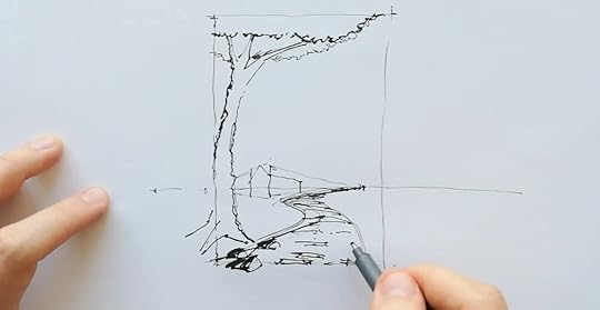 Step 1: PreparationFirst, I draw a picture plane which acts as a frame to fit in my drawing. Since it is countryside scenery, I draw a tree in the foreground to show the context. Then draw the horizon line at the lower third of the picture plane, which is a relatable eye-level view.