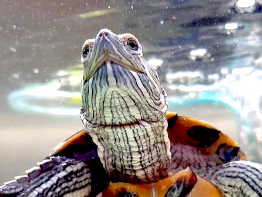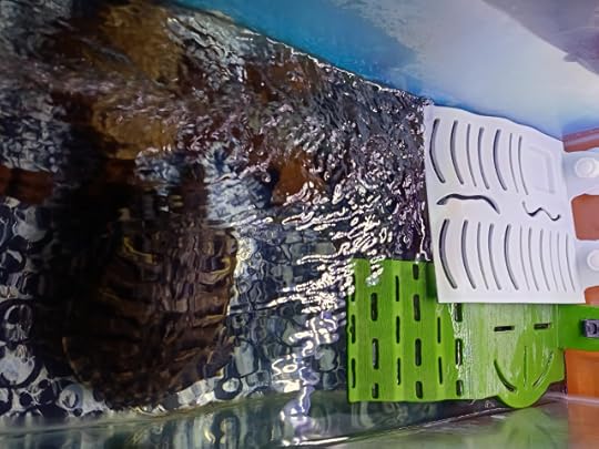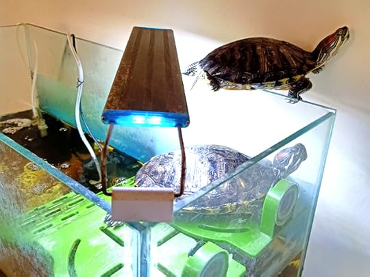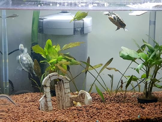 A bigger tankSome plants were put which Rusty and Silu devoured in a day. Now the tank had only a few stones, a water jet – which could no longer throw them off balance, bubbles, and a platform above the water where Rusty and Silu would bask occasionally under the bright warm light.