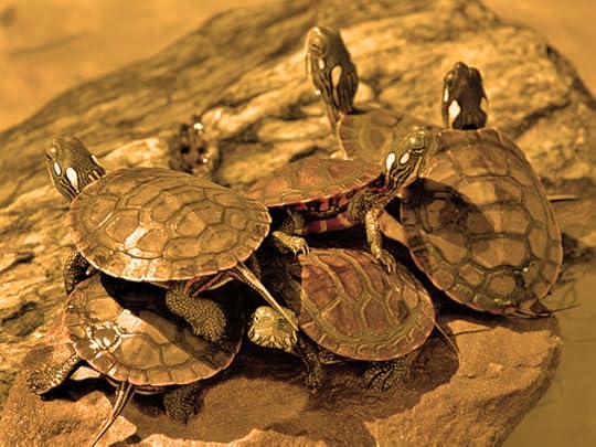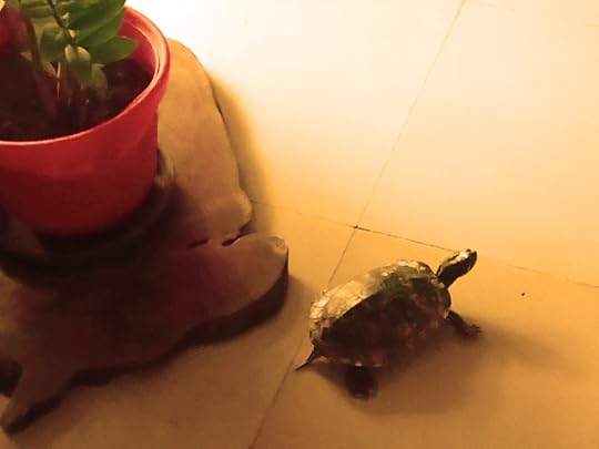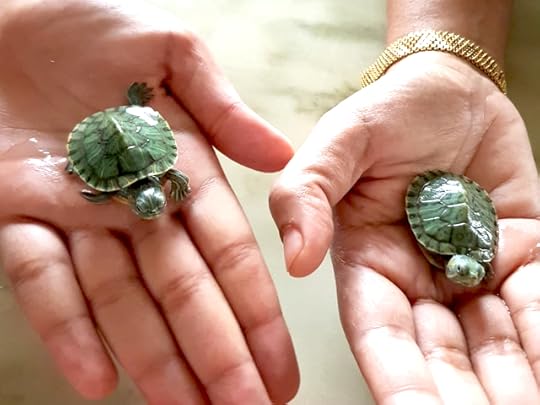 baby turtles on a pinkish soft floor with tentacles extending from it – the human handsSoon they were placed in water but in a much smaller place through which they could see what is outside. A couple of tentacles held the mouth of the container they were in and started moving then put the container slowly on a flat surface. The tentacles went away and a large green body was placed beside the container. Then there was lot of shaking and tumbling for a while. Finally the tentacles picked the container again and started moving.