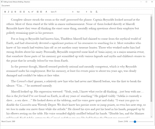 Combining Document FormatsThe old WPF-based version had two document formats: FlowDocument which was used for manuscript text, and MarkdownDocument which was used for notes and tickets. I was never quite comfortable with that, but FlowDocument was missing features I found useful for notes, and Markdown was very inadequate for a rich text document.