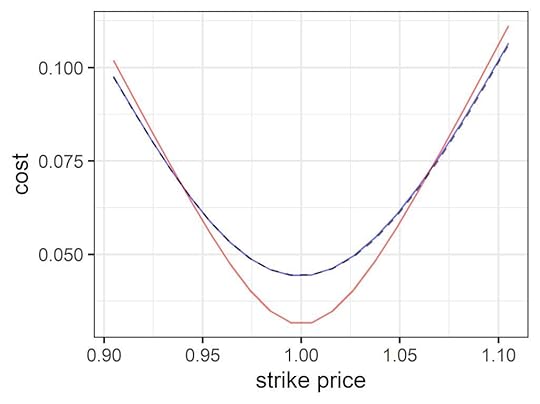 Figure 2. Left panel shows Black-Scholes model cost (blue line) for 1-month straddle options, versus average payout for a lognormal distribution. Right panel shows the same for S&P 500 historical data. The red line shows the quantum model where volatility follows the smile curve. The Black-Scholes model is well calibrated for the artificial lognormal data, as expected, but the quantum model is a better fit for the market data.So to summarize, the volatility smile is definitely real – even if the oscillations which produce it in the model take place in the imaginary plane.