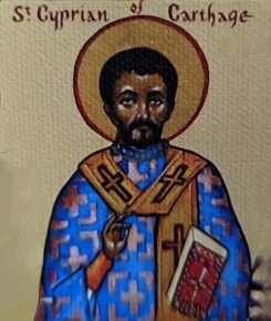 Photograph edited from an icon called “Saints of Africa.”[St. Cyprian] chased me down, he would not let me go. I spent half a year in Kenya and the Catholic missionaries I was working with in northern Kenya, were building these outstation churches, they were using Ethiopian style iconography which made me consider looking into this Orthodox thing. When I came back from Kenya there was an Orthodox Church in America parish at one time located near the Virginia Union University campus where I was doing some study in religion, St. Cyprian of Carthage Orthodox Church. I visited and I saw that on one side of the Iconostasis was a full size icon of St. Moses looking like my father, and another icon on the other side, of St. Cyprian looking like me, and the icon of Christ and the Theotokos were about the same skin tone as my mother, and all these white people were bowing down and kissing these icons. And just the image of St. Cyprian really caught my attention, but I went along my merry Baptist way. Several years later I was asking questions about how to deepen my prayer life. Then, while playing this video game called Second Life, just for fun I went looking for Orthodox Christians in Second Life, and, I kid you not they had a Second Life version of St. Catherine’s Monastery in Sinai. And one of the icons in this monastery was of St. Cyprian of Carthage. So I printed up a little picture of him from the internet… and I eventually came to visit that parish again, and I walked in… and I could almost imagine that icon of St. Cyprian looking back at me and saying, “told you to come home, boy.”