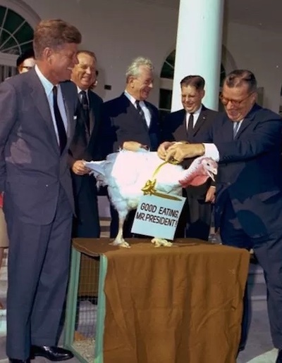 President John F. Kennedy in 1963In 1963, President John F. Kennedy was gifted a mammoth 55-pound turkey in what was by then an annual event conducted in the White House Rose Garden. During the photo session he spontaneously declared, “We’ll just let this one grow. It’s our Thanksgiving present to him.” True to his word, Kennedy ordered the turkey to be sent to a farm in California. Days later, as this was being done, extending the turkey’s life, President Kennedy was assassinated in Dallas, Texas.