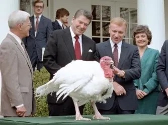 President Reagan with the first true “pardoned” turkey in 1987The turkey pardon (both the word and the act) truly entered the equation in 1987 with President Ronald Reagan. Even then it was spontaneous and completely unplanned. During that year’s Thanksgiving turkey gifting photo session, a reporter asked President Reagan about pardoning Iran-Contra aids. Reagan sidestepped the question, pointing at the 55-pound turkey and joking, “I’ll pardon him.” And he did.