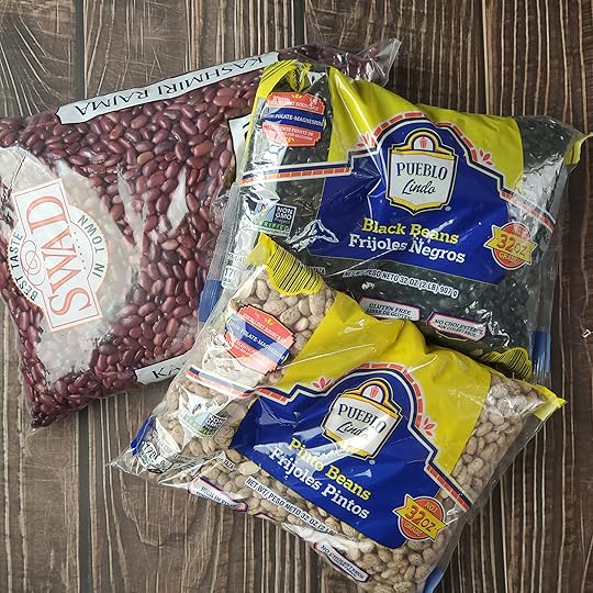 Critical to this are dried beans, the bigger the bag, the cheaper they are per ounce. So I went with 32 oz bags. For some reason, the red beans were twice as expensive as the black and pinto beans, but I think three different beans is important to texture. To this I added yellow squash, zucchini, and carrots and "rewards" — something to break up the textural experience, and then some canned extras, yellow corn, crushed tomatoes and Textured Vegetable Protein (which is amazing stuff — it arrives dry and you just put it in liquid to reconstitute it). This keeps it from being boring because, for me, it has to be worth eating also. The TVP was the most expensive item, but if you get it in bulk, you'll have it for next time. You could also substitute it for more vegetables, but I think it makes a big difference. Spices were chili, cumin, and Better that Bullion Vegetable, which is a great umami flavor. You could also use soy sauce since the Better than Bullion is one of the more expensive things here, I think it's worth it thought.