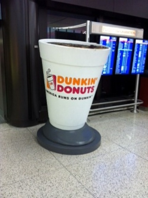 Just when I couldn’t be more shocked by life, I ran into this life-sized Dunkin Donuts coffee cup in the Boston Logan Airport. Will wonders never cease!