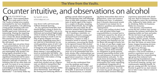 From my side of the bar, I get to watch how alcohol acts as a depressant, an effective tranquiliser that neither makes over-consumers more fascinating nor feel any better about themselves. And although the freeing and fortifying effects of getting a touch oiled can generate fun free-flowing chat, and although there is little that compares with the taste of spirits aged in the tropics for a couple of decades, stepping around Aberystwyth, day or night, illustrates the easy habit, the destructive mission that binge-drinking can almost instantly become.