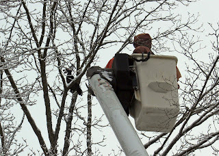 A tree service company brought in the big gun: a large lift truck. They sent their guy up with a couple of big towels, and he gently extracted the crow from the tree, wrapped it up, and the Animal Services lady received the bundle. He was pretty feisty, so it looked like he'd be okay. It seemed he had been tangled in string, attached to a stick. Be careful with string, people! Sometimes squirrels and crows take it to augment their nests, but it can be a real hazard.