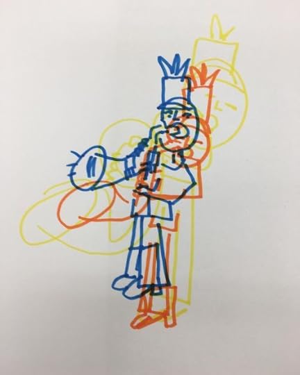 Can you draw a trumpet player with your eyes closed in three minutes? One minute per color, one drawing on top of the other, start with yellow, then orange, then blue. Somehow the horn player shows up. Making Comics 1, UW Madison @uwmadison @uw_artdept