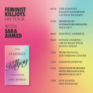 I am glad to be embarking now on a book tour, which we are calling Feminist Killjoys on Tour (you can find some of the events listed here).