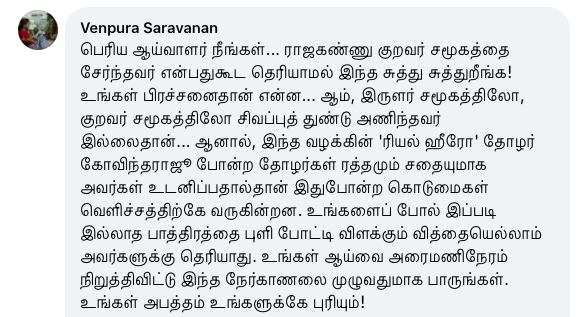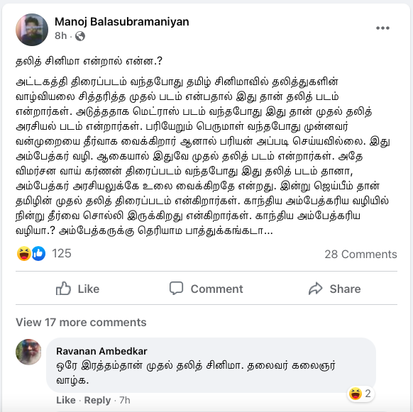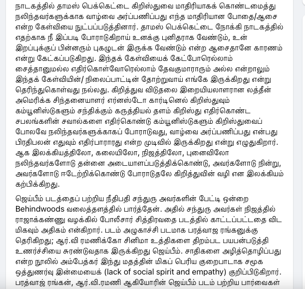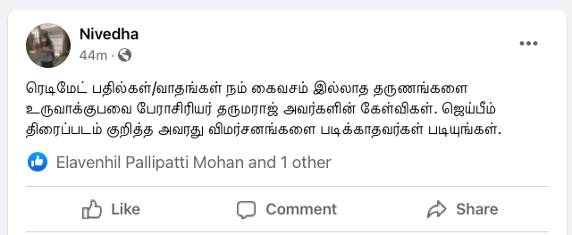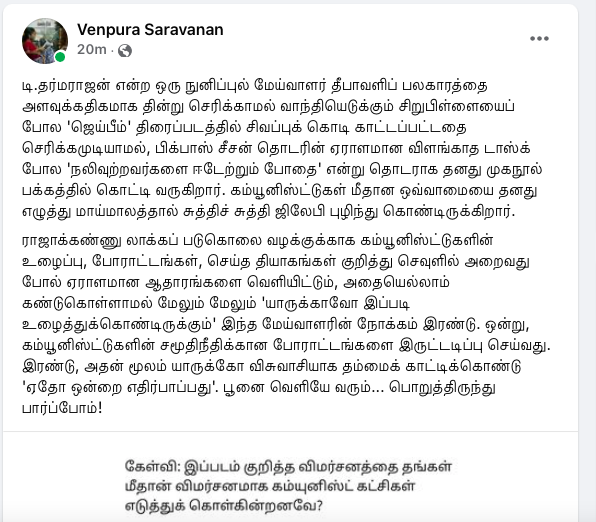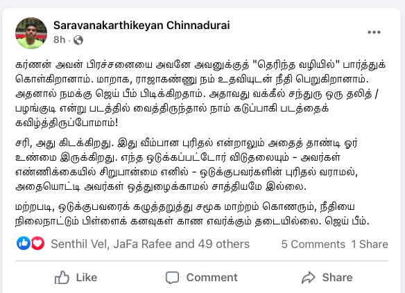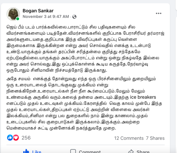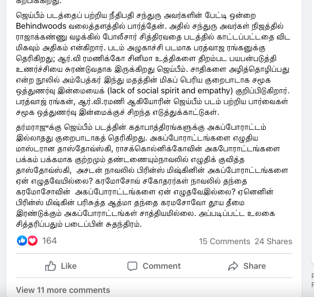 Siva SankarNovember 3 at 10:05 AM · பொதுசமூகத்திற்கு காலா ஏன் பிடிக்கவில்லை அல்லது ஜெய்பீம் ஏன் நெருக்கமாகின்றது?சிறுபத்திரிக்கைகளின் அகால மறைவுக்கு பிறகும் அச்சு ஊடகத்தில் கணிணி பயண்பாட்டின் பின்னர் புற்றீசல்களாய் முளைத்தெழுந்த, இடைநிலை பத்திரிக்கைகளால் காயடிக்கப்பட்ட அல்லது நுண்ணுனர்வு என்பதே இல்லாமல் உருவாக்கப்பட்டு நம் முன்னே கொட்டப்படும் தொழிற்சாலை எழுத்து கழிவுகளின் மத்தியில் பேராசிரியர் Dharmaraj Thamburaj போன்ற அசல் சிந்தனையாளர்களால் மட்டுமே வாசகனுக்கு மீட்சியுண்டு.வெகுஜன சமூகம் இயங்கும் தளத்தின் உள்ளே உள்ள அனைத்து விகாரங்களையும் ஓளிபாய்ச்சி் நமது நுண்ணுர்வை மீட்டெடுக்கும் எழுத்து.இது வெறுமே திரைப்படத்திற்கான விமர்சனமாக பார்ப்பதென்பது சரியானதல்ல. அதனுள் இயங்கும் பொது மனதின் அரசியலை உற்றுநோக்குவதே. அதை எப்போதும் போல சரியாக சொல்வதற்கு வாழ்த்துக்கள் தர்மராஜ்(பி.கு. பரத்வாஜ ரங்கன் போன்ற சினிமா தெரியாத எலைடிச எண்ணங்களை கொண்டவர்களின் முட்டாள்தனமான விமர்சனங்களை நாம் முற்றிலும் ஓதுக்கிதள்ளுவதும் நல்லது)