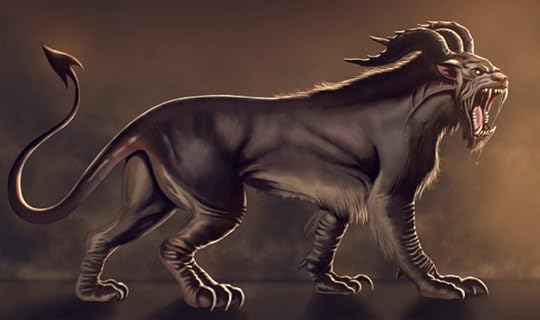 Taraqeu is a female feline beast that is impressive to behold. She is bigger than a lion, with an enormous head of jagged teeth. Her horns are thick, mostly smooth, and curve back towards her tail. There are dozens of tiny, sharp, thornlike pieces spread out on her horns. It would be impossible to sit on her back and grasp her horns. She has a massive chest and a long torso. Her four legs allow for quick movement, but the most impressive part is that she can climb most anything. She dives and lunges at her prey. Her fur is brown and gray and longer, like that of a raccoon.