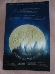 The play was “Into the Woods.” It’s a musical with words and music by Stephen Sondheim. The plot (?) is a mishmash of fairy tales. We had Cinderella, Little Red Riding Hood, Jack and the Bean Stock, Rapunzel and a cameo appearance of Sleeping Beauty and the Three Little Pigs, and a very odd cow. And, or course, there was a witch — and giants.