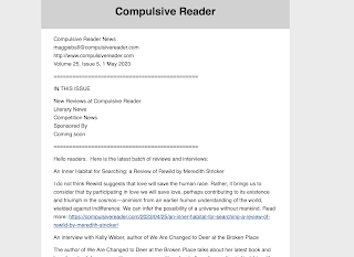 The latest issue of Compulsive Reader newsletter has now gone out and heading for inboxes around the world. This month's issue features 11 fresh reviews, 3 interviews (not counting our Compulsive Reader Talks interview with the wonderful Ashley Kalagian Blunt, two new giveaways of some very exciting pre-release books, and a full round-up of literary news (including a bit of news about my own upcoming festivals - both in one weekend - lucky me).  If you haven't received it yet, you can view it in your browser or to sign up for free (of course), just visit Compulsivereader.com and enter your email address in the upper right hand corner.  Couldn't be easier!