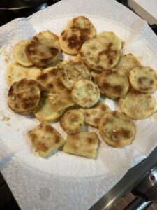 Slice your squash in thin discs but not TOO thin or they’ll fall apart. Mom always cut the necks off and sliced them longways making a few rectangular pieces. These were the most prized in my book. Beat the egg and buttermilk together in a shallow bowl. Add the flour to a second shallow bowl. Some people season their flour, but I always miscalculate how much I’ll need so I season the finished dish. Add enough oil to cover the bottom of your skillet. Cast iron is great but I just use the BIGGEST skillet I can find so this goes faster. Get the pan hot but not smoking. Dip the squash in the egg/buttermilk mixture then dredge it in the flour, shaking off the extra. Add to the hot skillet.