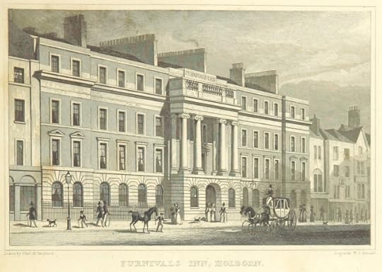 For several hundered years stood Furnival’s Inn opposite the church of Saint Andrew’s in Holborn. Though originating as an Inn of Chancery (offices for judicial clerks) it had, by 1818, been rebuilt and transformed into apartments.