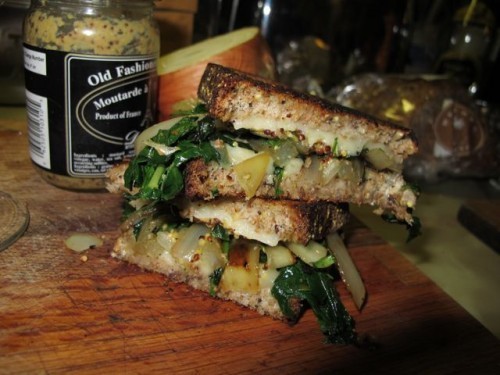 The end of my over scheduled schedule came to a halt at 10 pm on Sunday night as I sent off my last obligation–a gigantic freelance project. I needed to celebrate deeply these weeks and weeks leading up to Sunday night at 10pm. So, I made a grilled cheese sandwich. I sauteed some local sweet onions and spinach together with fresh tarragon. Sliced up some sharp cheddar. Used one of my favorite local breads a sunflower multi-grain and added some nice grainy mustard.
