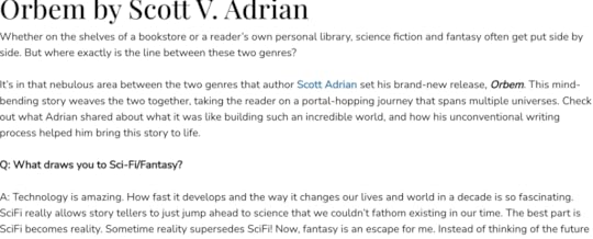 Check out this all new author spotlight on Scott V. Adrian. There’s an interesting Q&A about Scott and gives a little insight into his process for writing Orbem.