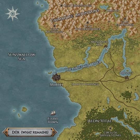 The empty village of Prospect didn’t exist prior to this exercise, and I’m not in love with the name. Otherwise, I’m pleased with my efforts. If nothing else, it forced me to name the body of water to the west of Mirth: the Sunswallow Sea.