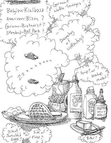 If you haven’t read Temp (and you should), waffledogs are my food of the fantastic future, where two of the greatest vittles in known existence are combined into a single confection called, you guessed it, the waffledog. I think waffledogs could be salty or sweet and enjoyed as breakfast, lunch, dinner, blinner, or an any time snack. I’m open to franchising pitches, although the only thing I know about the restaurant business is how to eat. Still, it could happen.