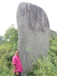 பிரம்மாண்டப் பாறையின் ஒரு பக்கம் உடைந்து போய் இருக்கிறது. மேலே, இரு விரிசல்கள்! ஆம்: எத்தனை மழை, புயல், வெய்யில் அனைத்தும் இத்தனை ஆண்டுகாலம் சந்தித்து இன்றும் நின்று இருக்கிறதே!