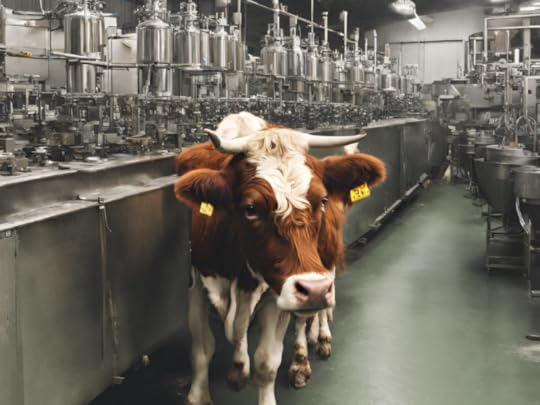 But also, this is what AI comes up with when you ask for a picture of a cow working in a canning factory: