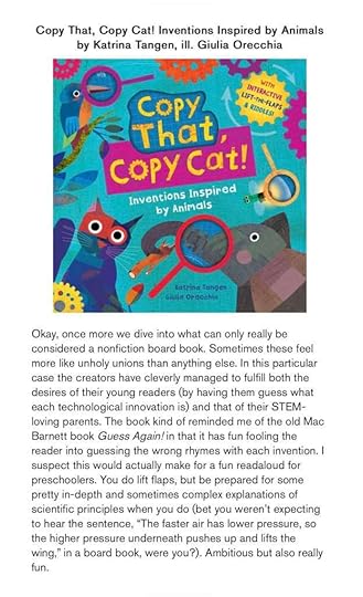On the same day, COPY THAT, COPY CAT appeared on Betsy Bird’s Great Board Books list! She’s a big time librarian blogger who does a series of best of the year lists—one for each day of December. I’ve read her blog for a long time, so I was very excited to discover Copy Cat there on the first day! (I may have squealed a bit.) And then I was shocked to find it on the second day’s list too, for Picture Book Readalouds!