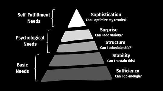 Let’s walk through the pyramid from the bottom up to reveal how sufficiency, stability, structure, surprise, and sophistication can help you establish and achieve goals sustainably and with less stress.